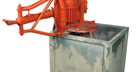 Blandaren som är orangefärgad sitter monterad på ett fyrkantigt brukskar i aluminium. Murbruket fylls på i karet och rörs sedan om av den eldrivna omröraren.