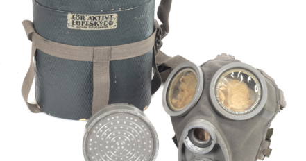 Gasmask m/1936 i axelremsväska i papp, original. För aktiv civilbefolkning BICAPA 1939.