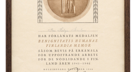 Medalj från Finlands president till en av de mödrar som tog emot ett finskt krigsbarn 1941-1946.