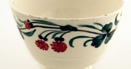 Kopp i benvitt porslin med handmålad dekor. Troligen 1830-40-tal.